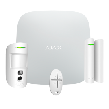 Application mobile et logiciel PC, Le kit contient la centrale Ajax Hub AJ-HUB-W, un contact magnétique AJ-DOORPROTECT-W, un détecteur de mouvement AJ-MOTIONPROTECT-W et une télécommande AJ-SPACECONTROL-W.