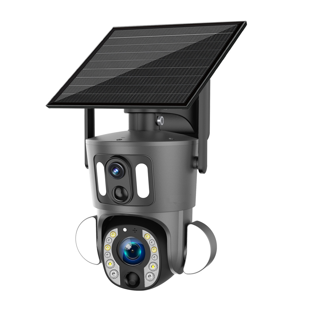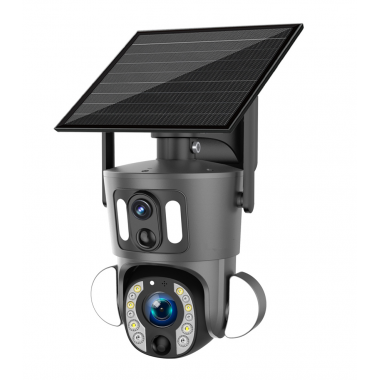 Caméra PTZ 4G SOLAIRE à double objectif intégrée, caméra fixe 3MP H265 2-8mm, caméra PTZ 20X 3MP, H265, 5-50mm. (détection PIR 10m) Panneau solaire 9W intégré, charge en continu la caméra avec batterie Lithium de 20A, amovible pour installation déportée du panneau. Détection humaine et suivi automatique de la personne, réception de notifications avec double image sur détection, micro et haut-parleur pour audio bidirectionnel a distance, mode nuit en N/B avec IR portée 30M, ou leds blanche en mode couleur. Carte SD 64Go incluse (capacité max.256Go), Waterproof IP66, Application Smartphone avec gestion des alarmes, enregistrements, et autres réglages.